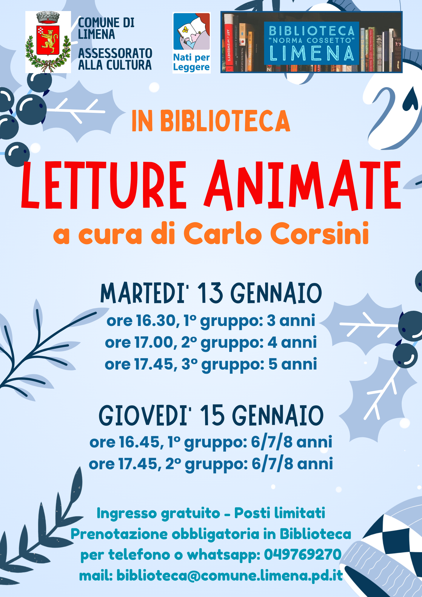 L'Assessorato alla Cultura ha organizzato, per giovedì 15 gennaio, un pomeriggio di letture animate a cura di Carlo Corsini.